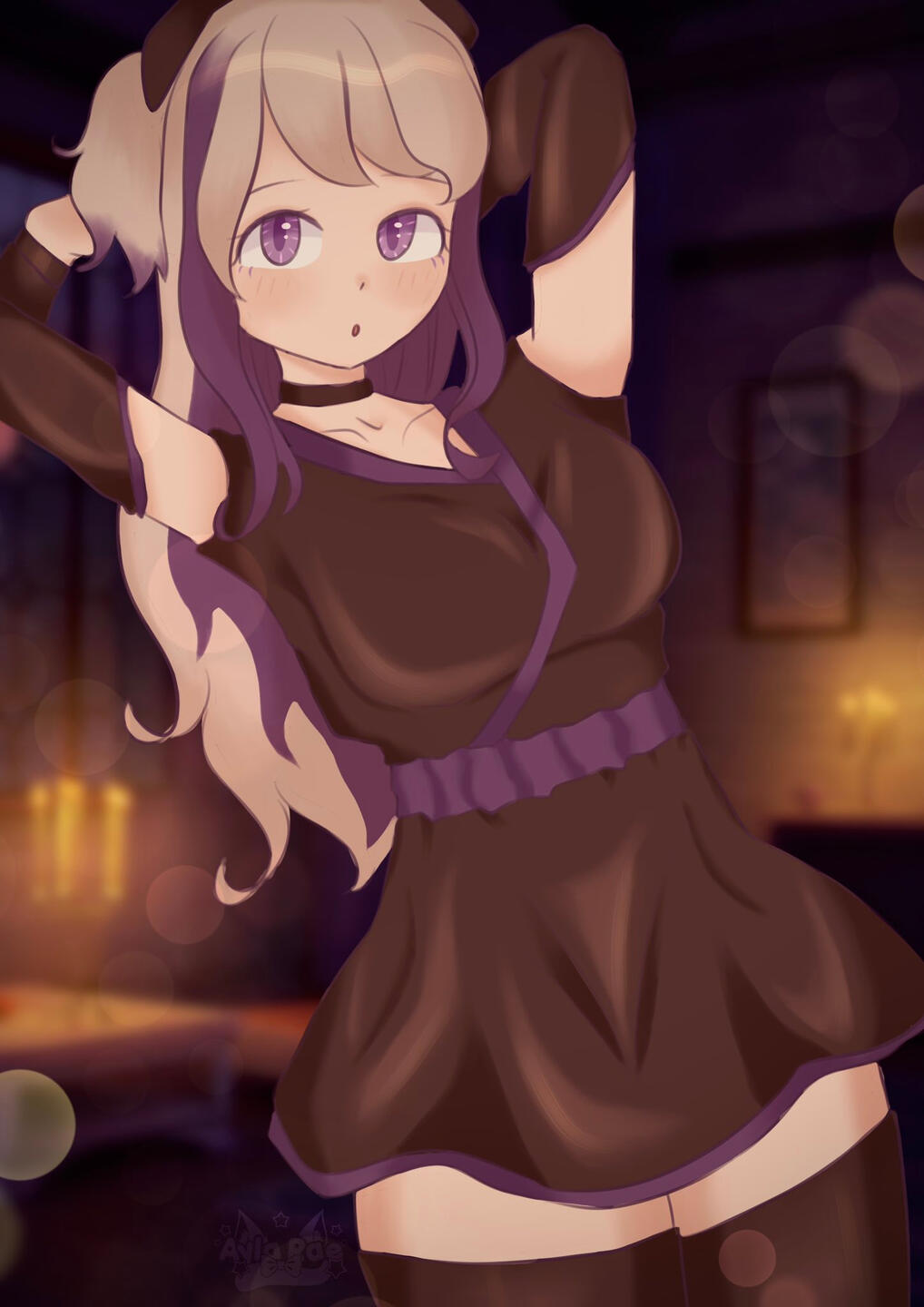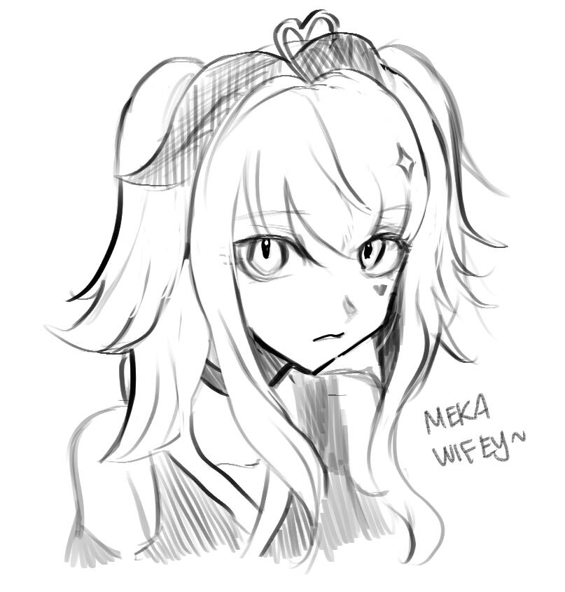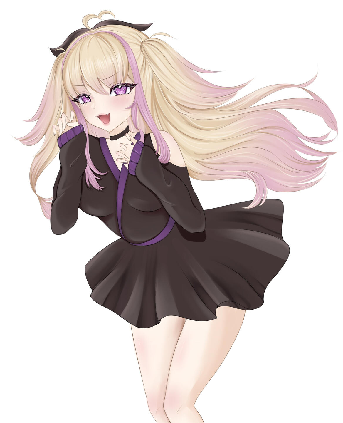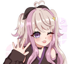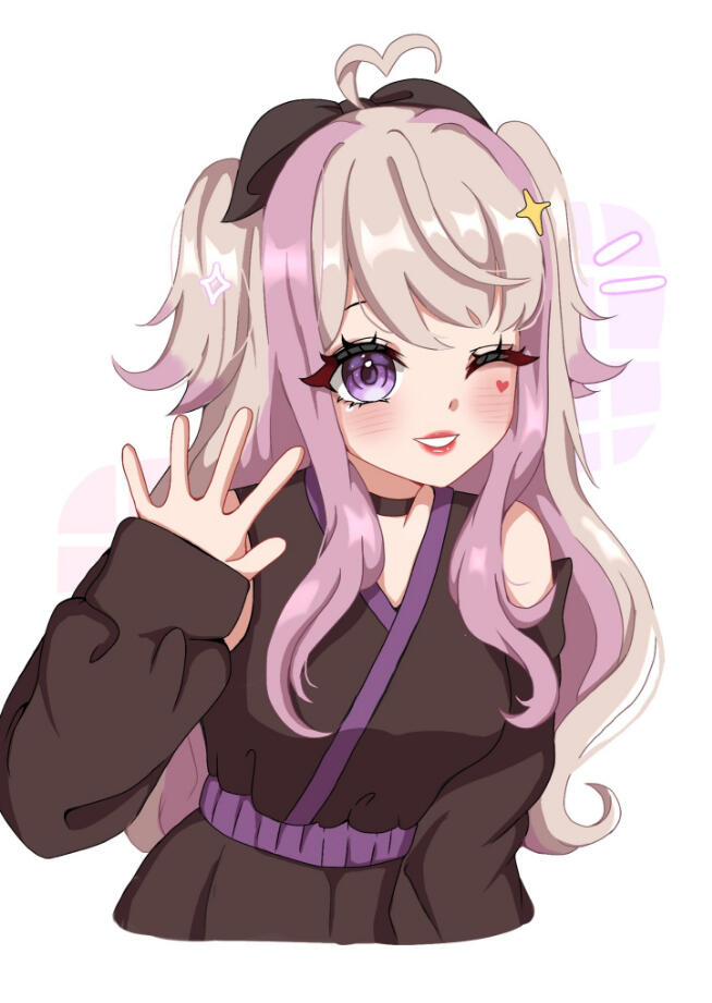 • key characteristics: purple eyes, pink hair stands, bow on top of her head, tails and ears are very wispy!